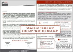 Vous pouvez envoyer un chèque au CCEM, ou donner directement sur cette page. Vous recevrez alors un reçu fiscal vous permettant de déduire 66% de votre don.